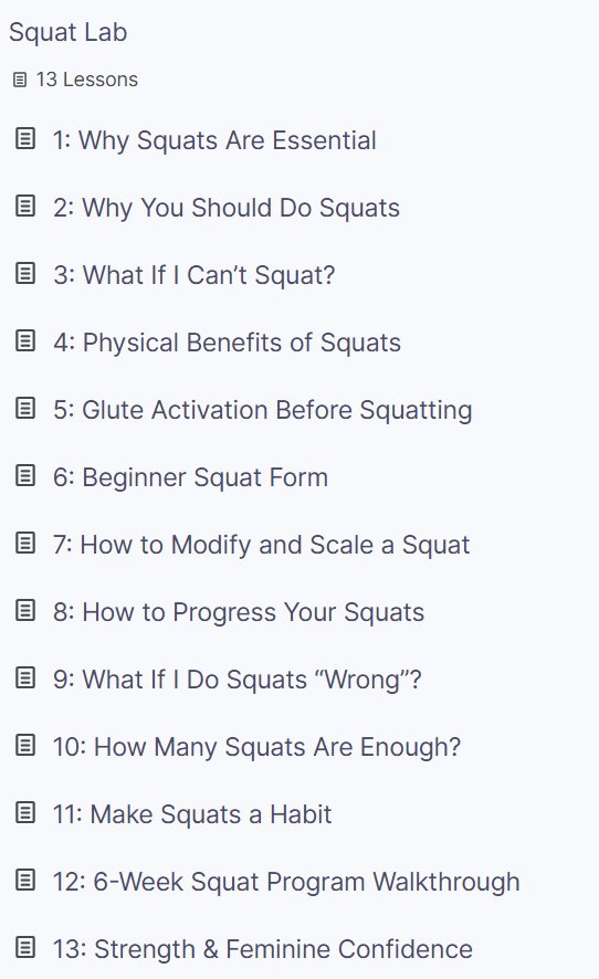 Squat Lab is a simple, foundational video course designed to help you build strength, grow your confidence, and increase your Longevity! (Preview video below)